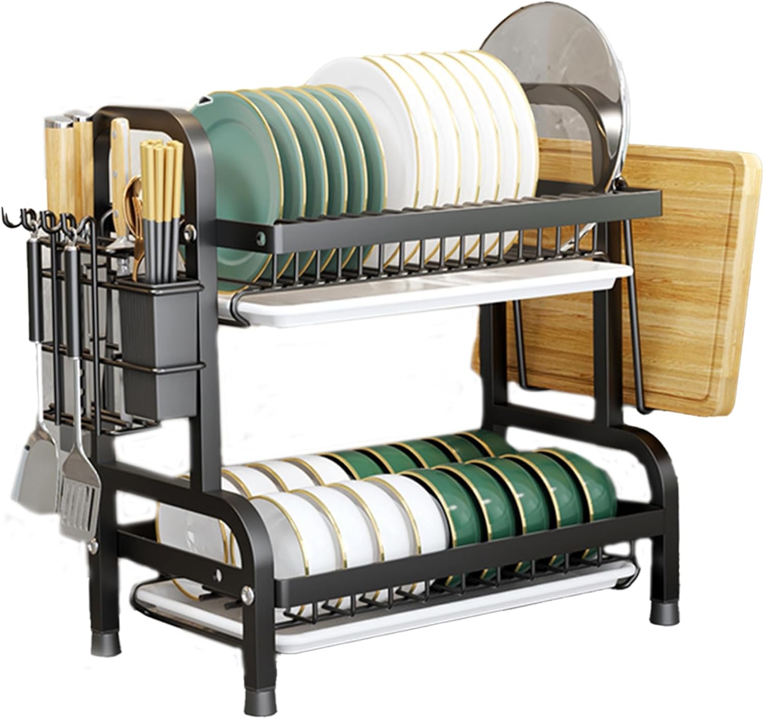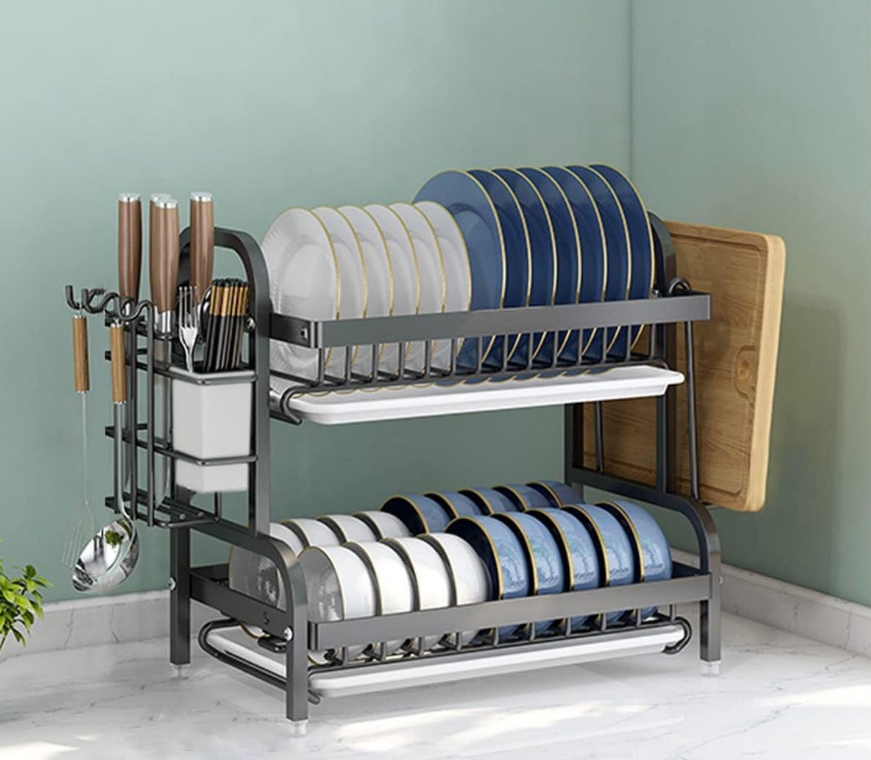 Este moderno escurridor de platos de doble nivel está diseñado para ofrecer máxima capacidad y funcionalidad, manteniendo tus utensilios perfectamente organizados y secos.